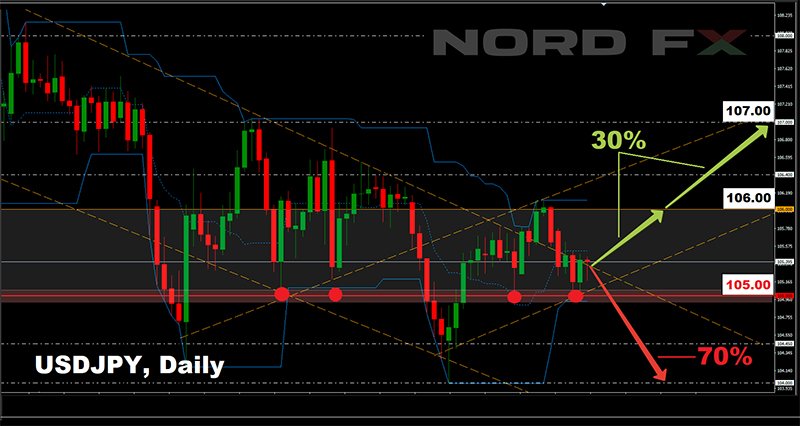 يأمل الـ 30٪ المتبقية من المحللين أن يظل الزوج داخل حدود القناة 1.2845-1.3035 وسيعود قريبًا إلى حدودها العليا. مستوى المقاومة التالي 1.3080 ؛ - الدولار الأمريكي / الين الياباني: في الوقت الحالي ، يتم دعم العملة اليابانية من خلال تراجع الرغبة في المخاطرة وارتفاع العائدات على السندات الآمنة. ومع ذلك ، فإن الين يقترب من مستوى الدعم الرئيسي عند 105.00 ، ويعد اختراقه مهمة صعبة للغاية. ما عليك سوى إلقاء نظرة على الرسم البياني لآخر 12 أسبوعًا. وخلفت المعارك على هذا المستوى في 2018-2019 العديد من الندوب التي لا تُنسى على أجساد الدببة.