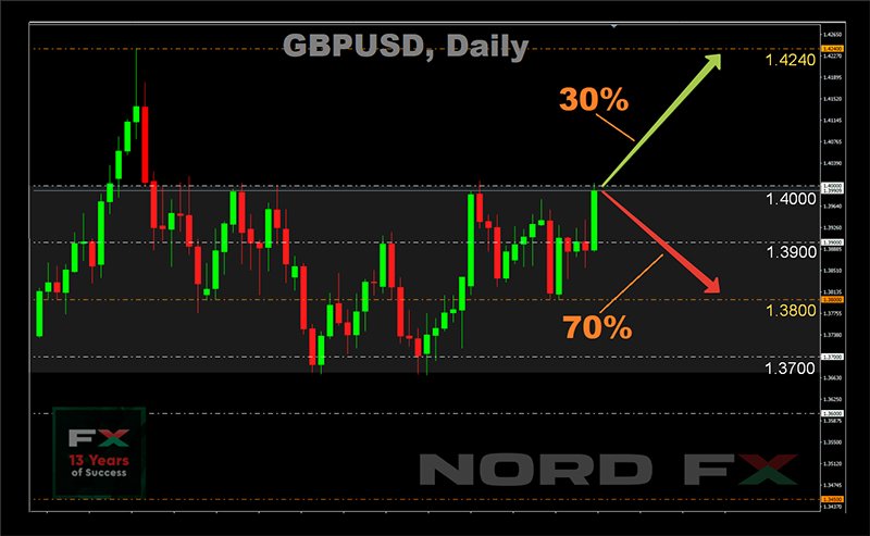 يعتقد 30٪ فقط من الخبراء أن زوج استرليني / دولار GBP / USD سيكون قادرًا على الخروج من نطاق تداول 10 أسابيع والارتفاع فوق المستوى 1.4000. في هذه الحالة ، سوف يندفع إلى أعلى سعر ليوم 24 فبراير عند 1.4240 ، وستكون مستويات المقاومة في طريقها هي مستويات 1.4085 و 1.4180.