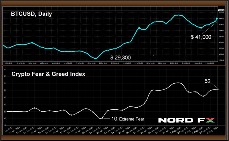 ارتد زوج BTC / USD من أدنى مستوى عند 29300 دولار في 20 يوليو ، حيث أضاف حوالي 40 ٪ ويتم تداوله في منطقة 41000-42500 دولار في وقت كتابة التوقعات. نما إجمالي رسملة سوق العملات الرقمية بنسبة 40٪ نفسها خلال هذه الفترة: من 1.19 تريليون دولار إلى 1.67 تريليون دولار. بالنسبة لمؤشر Crypto Fear & Greed ، فقد انتقل أخيرًا من منطقة الخوف الشديد إلى مركز المقياس ، حيث ارتفع من 10 نقاط إلى 52.