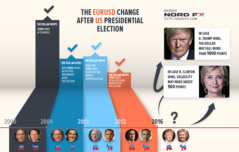 "If Hillary Clinton wins,” says NordFX chief analyst John Gordon, “volatility is likely to be smaller and will not exceed ± 5%. But these five percent for the EURUSD will make about 500 points.”