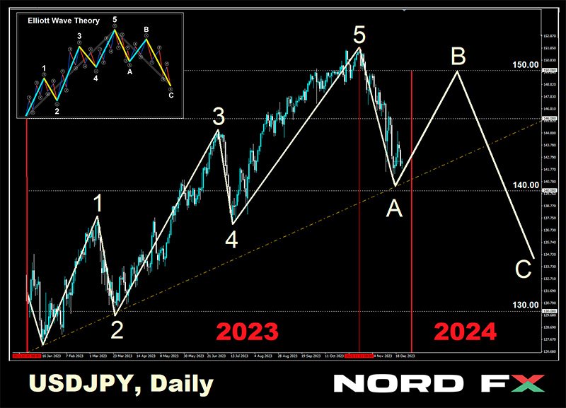 ● In conclusion, for those who favour graphical analysis, it's noteworthy to mention that the behaviour of USD/JPY throughout 2023 almost perfectly aligns with Elliott Wave Theory. If in 2024 the pair continues to follow the tenets of this theory, we can first expect a bullish corrective wave B. This will be followed by a bearish impulse wave C, which could lead the pair to the levels anticipated by proponents of a strengthening Japanese currency.
