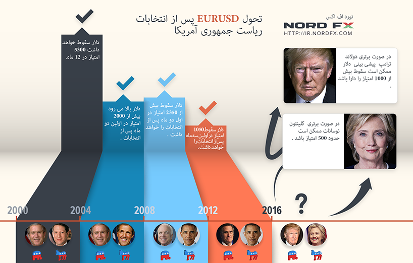 "اگر هیلاری کلینتون برنده،" جان گوردون تحلیلگر ارشد NordFX می گوید: ، "نوسانات به احتمال زیاد به کوچکتر و بیشتر از ± 5٪ تجاوز نمی کند. اما این پنج درصد برای EURUSD در مورد 500 امتیاز است."
