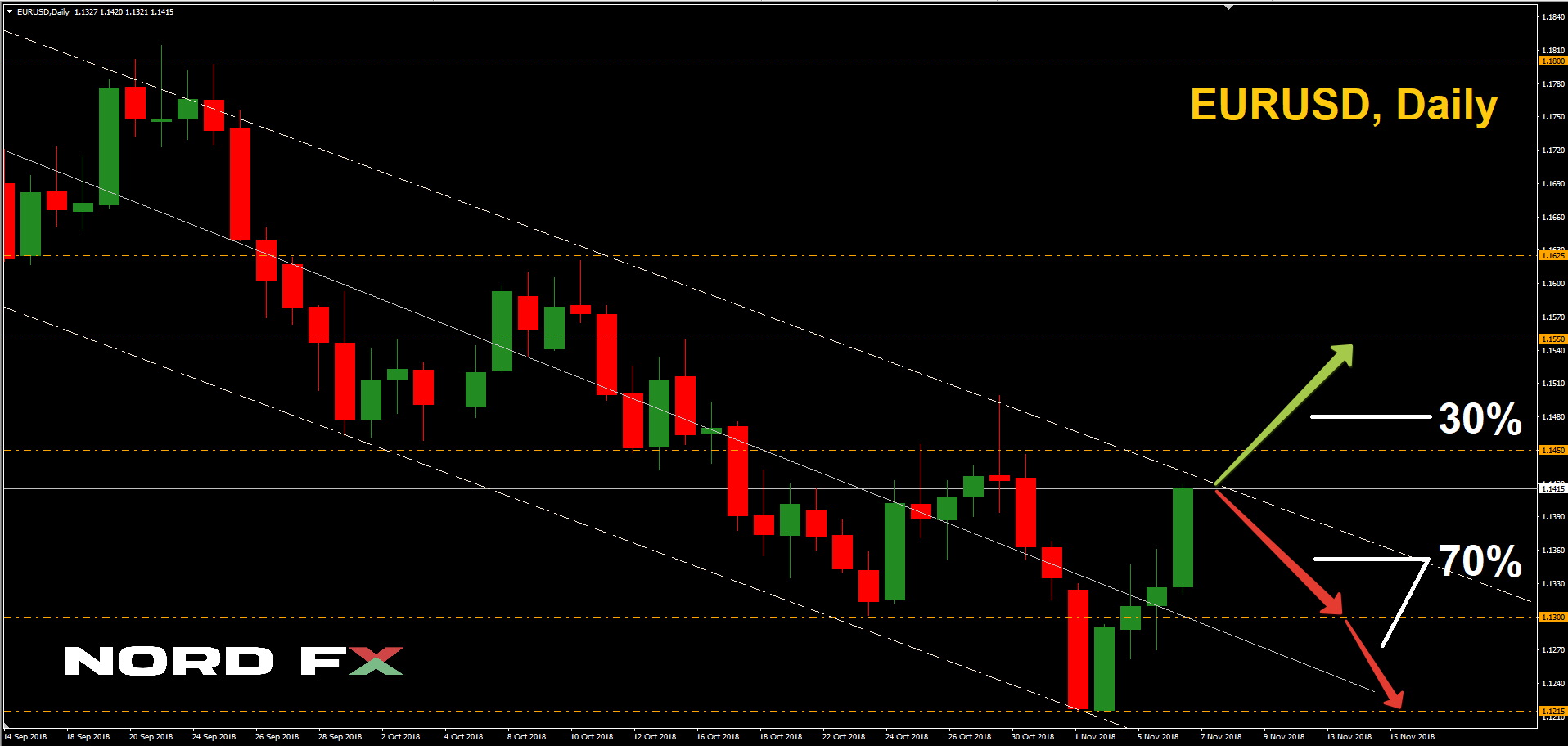 An alternative scenario assumes the rise of the pair to the level 1.1450-1.1550. However, this is likely to be a temporary correction, after which the dollar will continue to grow and the pair will fall. The market is almost certain that in December the US Federal Reserve will raise the interest rate, after which there will be several more increases in 2019, which is a decisive factor for the further strengthening of the US currency;