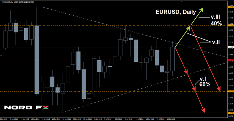 - EUR/USD. Quyết định lãi suất của ECB và cuộc họp báo của người đứng đầu Mario Draghi dự kiến vào thứ năm ngày 26 tháng 7. Nhưng không ai trong số này được dự kiến sẽ gây ra bất kỳ sự ngạc nhiên đặc biệt cho thị trường. Mối quan tâm nghiêm trọng hơn đối với đồng euro là do chuyến thăm của các quan chức Ủy ban châu Âu đến Washington, nơi họ sẽ thảo luận về các biện pháp trừng phạt và trả đũa trong cuộc chiến thương mại giữa EU và Hoa Kỳ với Tổng thống Trump. Tình tiết tăng nặng của tình hình có thể gây khó chịu cho cặp đôi, đó là lý do tại sao 60% các nhà phân tích đang chờ đợi nó quay trở lại mức 1.1575, và trong trường hợp sự cố - xuống mức thấp nhất tháng 6-7 tháng 7 ở mức 1.1500.