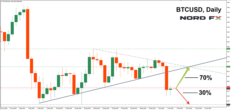 - Tiền điện tử. Người ta có thể nói rằng không có thay đổi trên mặt trận kỹ thuật số, bởi vì cặp BTC/USD đã không đi dưới mức lợi nhuận khai thác. Mặc dù nó làm cho các nhà đầu tư lo lắng, chỉ trong vài giờ giá bitcoin giảm 420 đô la, giảm xuống mức thấp nhất trong ba tuần là 6.215 đô la. Sự sụp đổ của thươc đo với tiền điện tử là do sự sụp đổ của thị trường chứng khoán Mỹ và báo cáo của IMF, nói về các vấn đề an ninh mạng và tiền tệ kỹ thuật số có thể trở thành một nguyên nhân mới gây ra lỗ hổng hệ thống tài chính toàn cầu. Sự vắng mặt của quyết định điều chỉnh của Mỹ (SEC) về yêu cầu khởi động ETF cũng không thêm sự lạc quan vào thị trường.