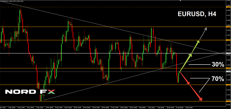 Khả năng Fed sẽ công bố tăng lãi suất từ 2,25% lên 2,5% vào thứ Tư ngày 19 tháng 12 là trên 75%. Ngoài ra, thị trường đang tự tin mong đợi một hoặc hai lần tăng thêm vào năm tới. Đối với sự tăng trưởng của tỷ giá đồng euro, có một sự không chắc chắn hoàn toàn ở đây. Draghi hứa sẽ giữ tỷ lệ ở mức 0 cho đến mùa hè năm 2019. Nhưng việc tăng lãi suất vào mùa hè này là một câu hỏi lớn. Vì vậy, hầu hết các nhà đầu tư hiện đang nhìn về phía nam, đến khu vực thấp trong năm, được ghi nhận vào ngày 12 tháng 11 năm 1.1215. Đó là mục tiêu chính cho cặp đôi. Hỗ trợ gần nhất là 1,1265;