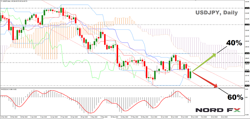 60% các nhà phân tích còn lại tin rằng một động thái như vậy của Ngân hàng Nhật Bản là không thể. Theo họ, xác suất giảm tỷ giá đồng đô la tại cuộc họp của Cục Dự trữ Liên bang Mỹ vào ngày 31 tháng 7 là cao hơn đáng kể. Trong trường hợp này, cặp đôi không chỉ có thể hạ xuống đường chân trời 106,75 mà còn vượt qua nó, lao đến mức thấp tháng 1 năm 2019 ở khu vực 105,00. 90% các bộ dao động và 100% các chỉ số trên D1 đang đứng về phai đà giảm;