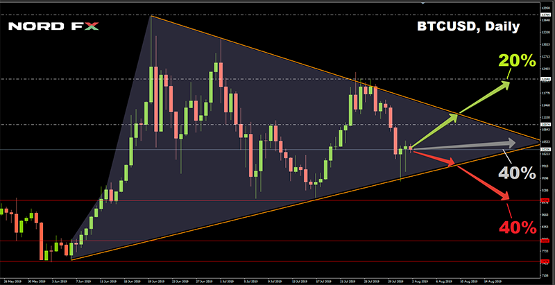 Tuần kết thúc với sự hài lòng một phần ba chuyên gia còn lại, những người đã giữ vị trí trung lập. Nếu bạn nhìn vào biểu đồ của hai tuần trước, bạn có thể thấy rằng cặp đã chuyển sang kênh bên 105.00-107.00 và hoàn thành phiên làm việc gần trung tâm hơn, tại 106,35. Do đó, cả ba kịch bản có thể được coi là hoàn thành - giảm, tăng và trung tính; - Tiền điện tử. Những người đam mê tiền điện tử, như nhà phân tích Tom Lee, nhà đồng sáng lập của Fundstrat, Anthony Pompliano, tiếp tục cố gắng nâng cao trạng thái Bitcoin, tuyên bố nó đã trở thành một tài sản trú ẩn an toàn, cùng với vàng hoặc đồng yên Nhật. Nếu chỉ từ ngày 08 đến 15 tháng 8, loại tiền kỹ thuật số này đã mất hơn 20% giá trị, sụp đổ từ 12.000 đô la xuống còn 9.500 đô la?