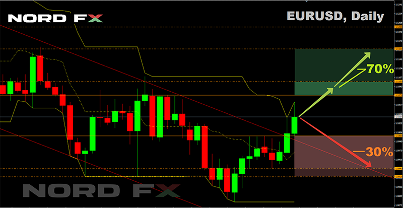 Sự sụt giảm của đồng đô la và sự gia tăng của cặp tiền được dự kiến bởi 70% các chuyên gia, những người dự báo được hỗ trợ bởi các bài đọc của 75% bộ dao động và phân tích đồ họa trên H4 và D1. Vùng hỗ trợ trong trường hợp tăng trưởng của cặp là 1.1000. Mục tiêu là 1.1075, 1.1100 và 1.1160.