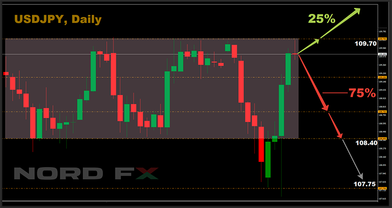 - USD / JPY. Dự báo cho cặp này là chính xác 100%. Hãy nhớ lại rằng, theo ý kiến của đa số các nhà phân tích (70%), được hỗ trợ bởi phân tích đồ họa trên D1, sự sụt giảm của cặp đôi đã dừng lại ở mức 107,80, sau đó đã từ chối để đi đến ngưỡng kháng cự 109,25 và sau đó đến mức cao nhất vào tháng 12 năm ngoái ở khu vực 109,70.