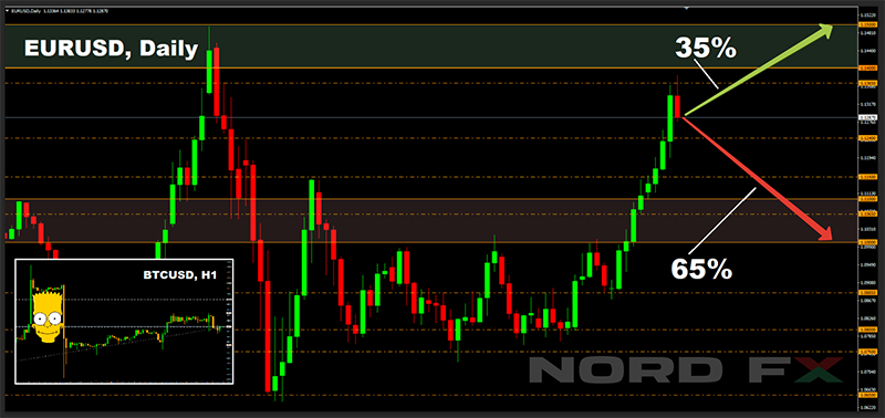 Đối với giai đoạn trước mắt, 65% các nhà phân tích tin rằng khẩu vị rủi ro sẽ giảm, làm hồi sinh sự quan tâm đến đồng đô la như một tài sản bảo hộ và cặp EUR/USD sẽ giảm đến vùng 1.1000-1.1100. Mức hỗ trợ tiếp theo là 1.0885. Phân tích biểu đồ trên H4 và 15% bộ dao động oscillator, mà đưa ra tín hiệu về sự quá mua của cặp tiền trên H4 và D1, hoàn toàn đồng ý với sự phát triển của các sự kiện này.